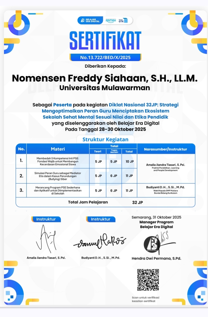 DIKLAT STRATEGI MENGOPTIMALKAN PERAN TENAGA PENDIDIK MENCIPTAKAN EKOSISTEM TEMPAT BELAJAR SEHAT MENTAL SESUAI NILAI DAN ETIKA PENDIDIK NOMOR SERTIFIKAT 13.722/BED//X/2025 (309.7Kb)