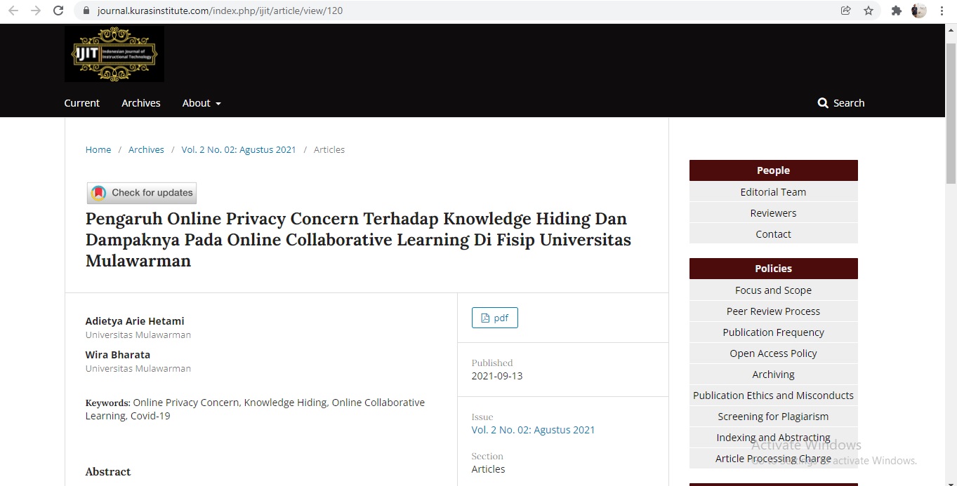 http://repository.unmul.ac.id/handle/123456789/17159| Title: | Pengaruh Online Privacy Concern Terhadap Knowledge Hiding Dan Dampaknya Pada Online Collaborative Learning Di Fisip Universitas Mulawarman |
