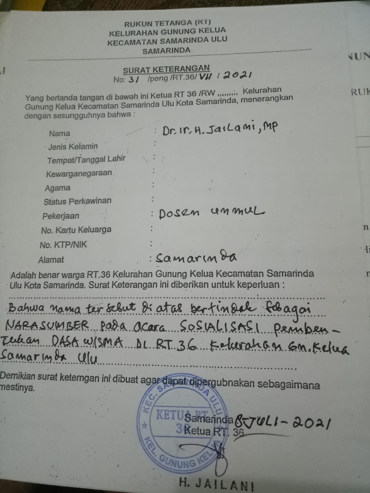 http://repository.unmul.ac.id/handle/123456789/17399| Title: | Surat Keterangan Narasumber Pada Acara Sosialisasi Pembentukan Desa Wisma di RT 36 Kelurahan Gunung Kelua Samarinda Ulu |