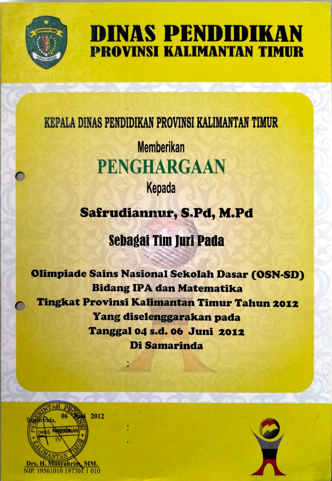 | Description: | Piagam Penghargaan sebagai Tim Juri Olimpiade Sains Nasional (OSN) SD Tingkat Kaltim Tahun 2012 |