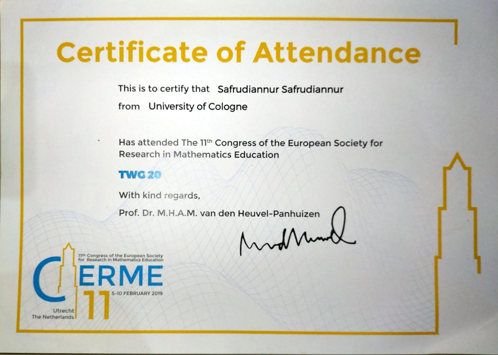 http://repository.unmul.ac.id/handle/123456789/18046| Title: | Certificate of Attendance The 11th Congress of the European Society for Research in Mathematics Education |