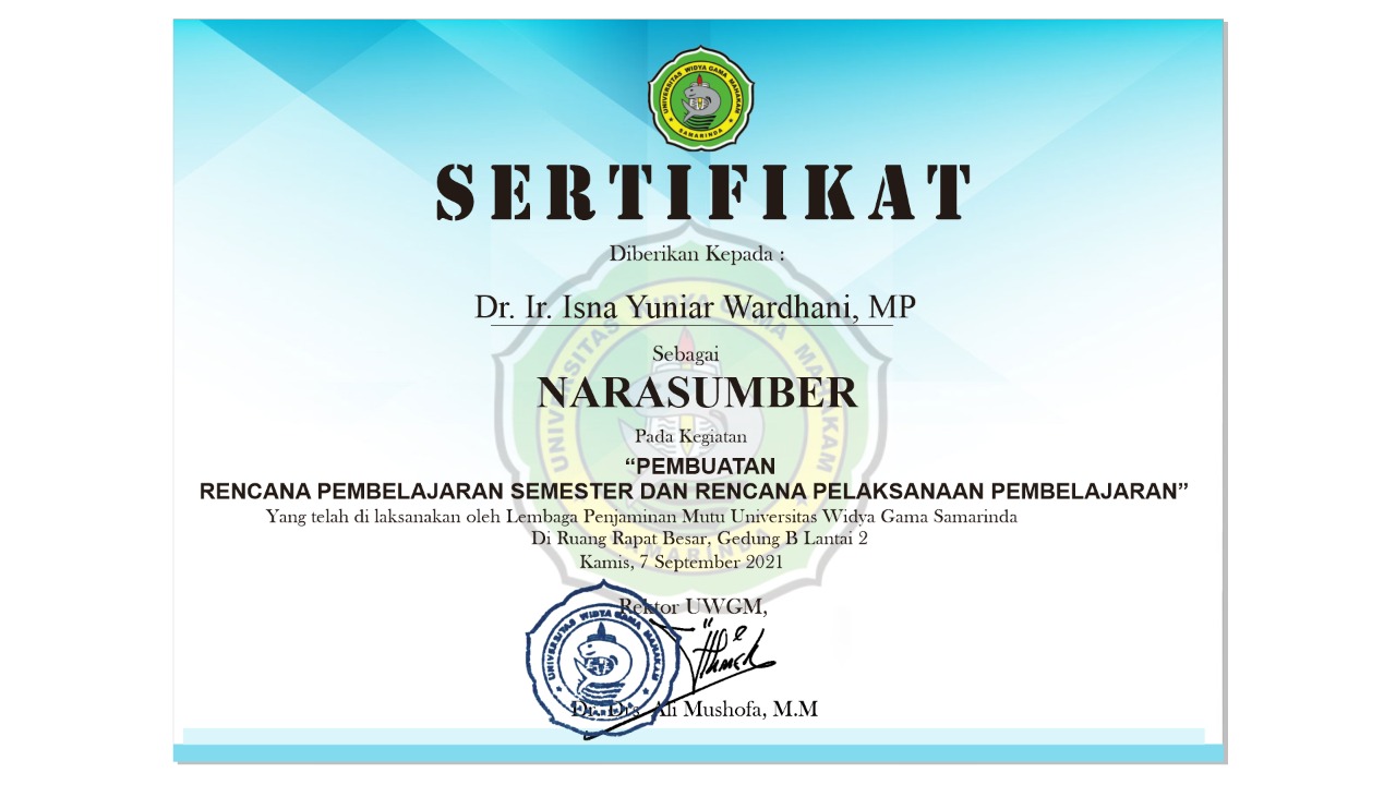 | Dr. Isna Yuniar Wardhani_Sertifikat -Seminar Ilmiah -(Narasumber) - 6 September 2021 - A4 (2).pdf | NARASUMBER Seminar Ilmiah Berkala Pusat Penelitian Biomaterial LIPI dengan topik Potensi Pengembangan Riset Kolaboratif untuk Pengolahan dan Pemanfaatan Hasil Hutan Tropis (BRIN) | 2.95 MB | Adobe PDF | View/Open |
