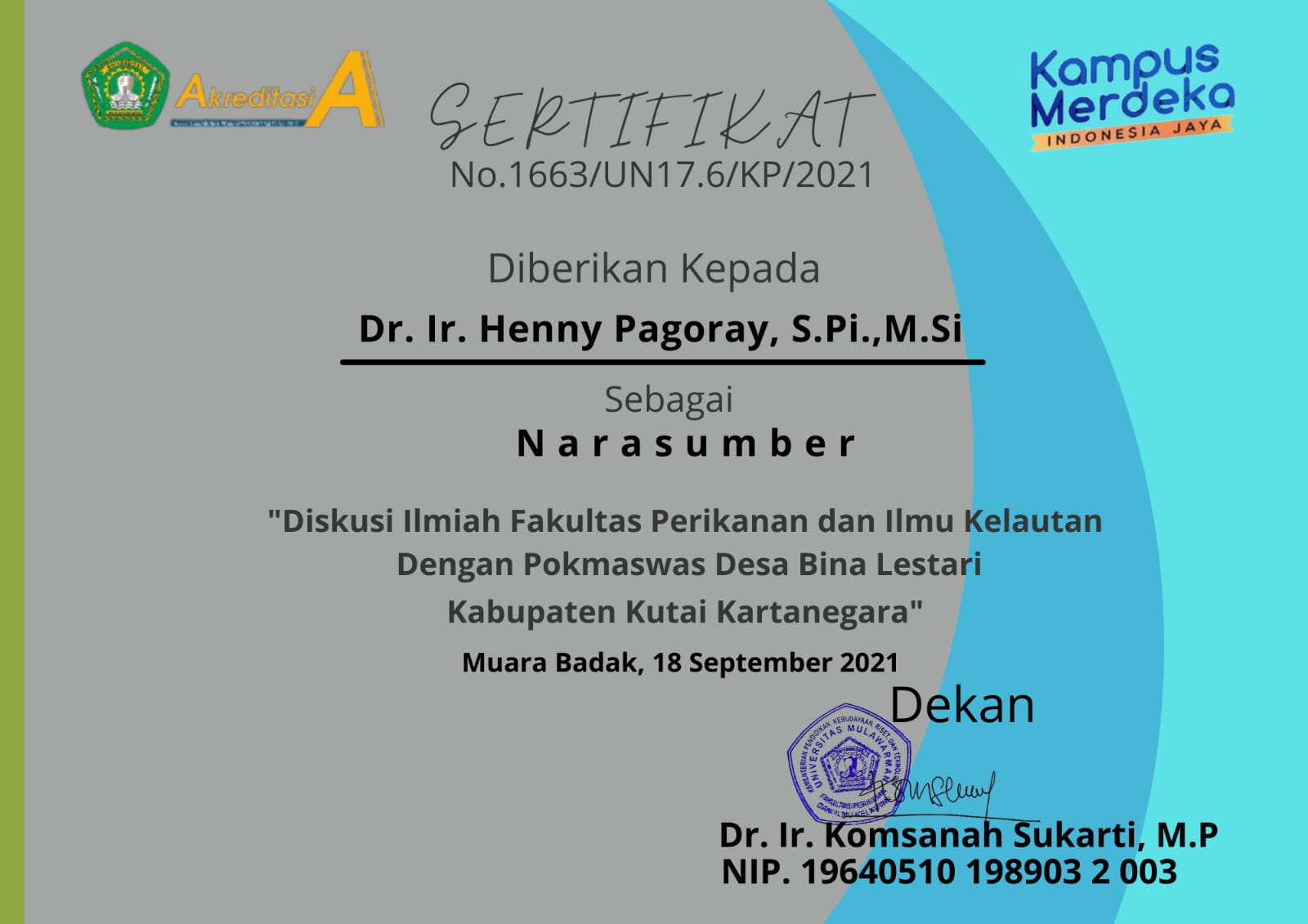 | Keywords: | Sertifikat Diskusi Ilmiah Fakultas Perikanan dan Ilmu Kelautan Dengan Pokmaswas Desa Bina Lestari Kabupaten Kutai Kartanegara |