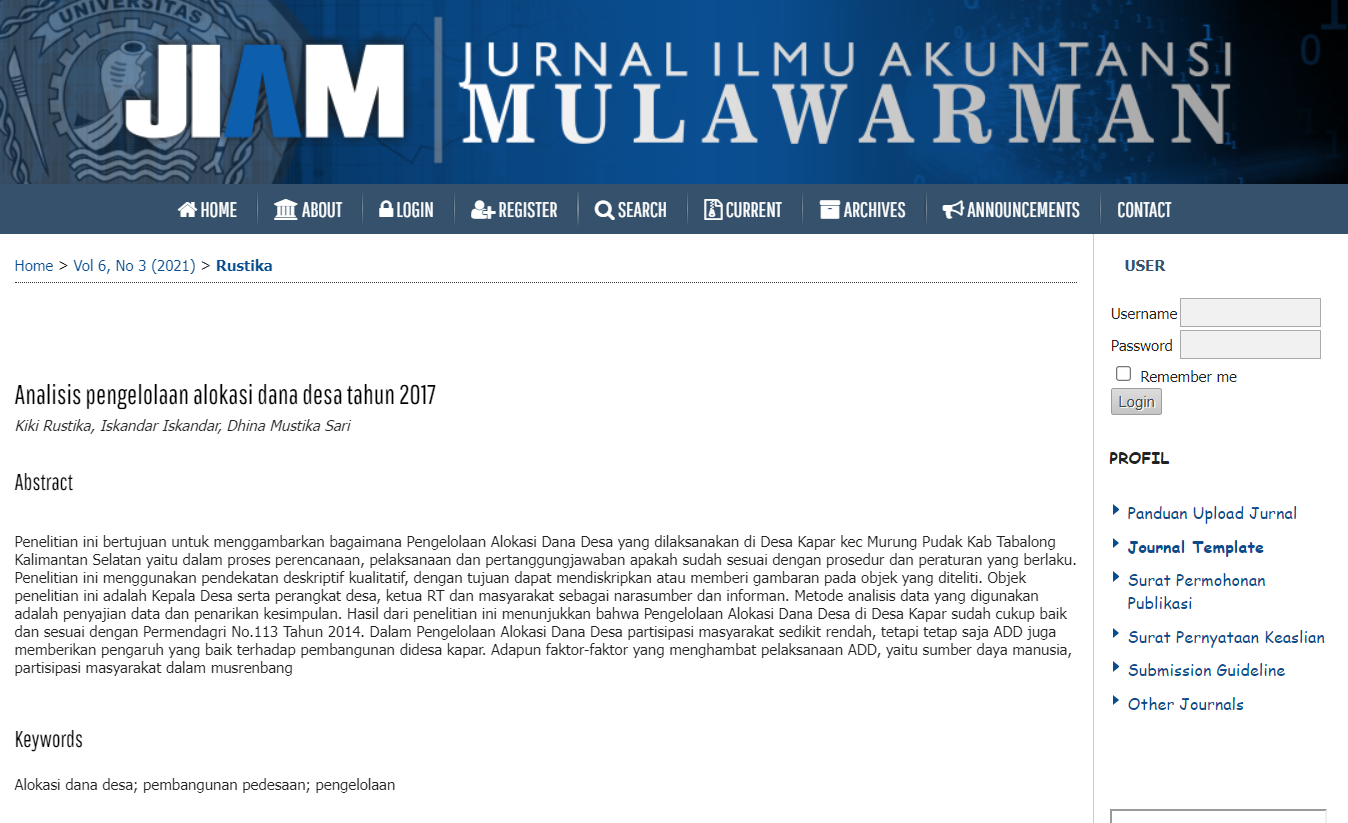 | Abstract: | Penelitian ini bertujuan untuk menggambarkan bagaimana Pengelolaan Alokasi Dana Desa yang dilaksanakan di Desa Kapar kec Murung Pudak Kab Tabalong Kalimantan Selatan yaitu dalam proses perencanaan, pelaksanaan dan pertanggungjawaban apakah sudah sesuai dengan prosedur dan peraturan yang berlaku. Penelitian ini menggunakan pendekatan deskriptif kualitatif, dengan tujuan dapat mendiskripkan atau memberi gambaran pada objek yang diteliti. Objek penelitian ini adalah Kepala Desa serta perangkat desa, ketua RT dan masyarakat sebagai narasumber dan informan. Metode analisis data yang digunakan adalah penyajian data dan penarikan kesimpulan. Hasil dari penelitian ini menunjukkan bahwa Pengelolaan Alokasi Dana Desa di Desa Kapar sudah cukup baik dan sesuai dengan Permendagri No.113 Tahun 2014. Dalam Pengelolaan Alokasi Dana Desa partisipasi masyarakat sedikit rendah, tetapi tetap saja ADD juga memberikan pengaruh yang baik terhadap pembangunan didesa kapar. Adapun faktor-faktor yang menghambat pelaksanaan ADD, yaitu sumber daya manusia, partisipasi masyarakat dalam musrenbang |