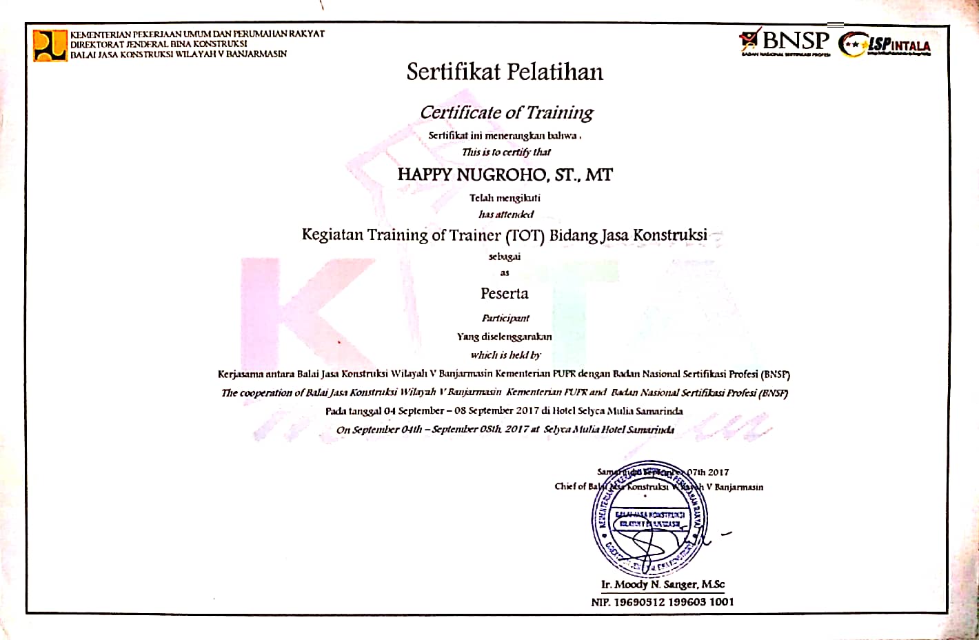 http://repository.unmul.ac.id/handle/123456789/34647| Title: | Pelatihan Kegiatan Training of Trainer (TOT) bidang jasa konstruksi |