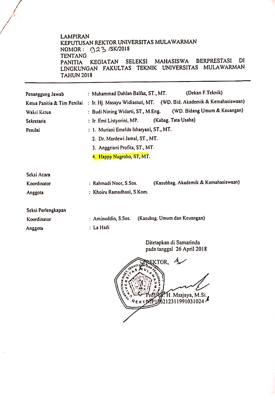http://repository.unmul.ac.id/handle/123456789/34657| Title: | Panitia kegiatan Seleksi Mahasiswa Berprestasi di lingkungan Fakultas Teknik Universitas Mulawarman |