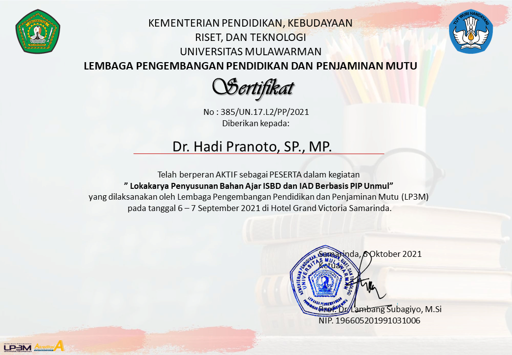 http://repository.unmul.ac.id/handle/123456789/35762| Title: | Sertifikat workshop IAD ISBD 2021 |
