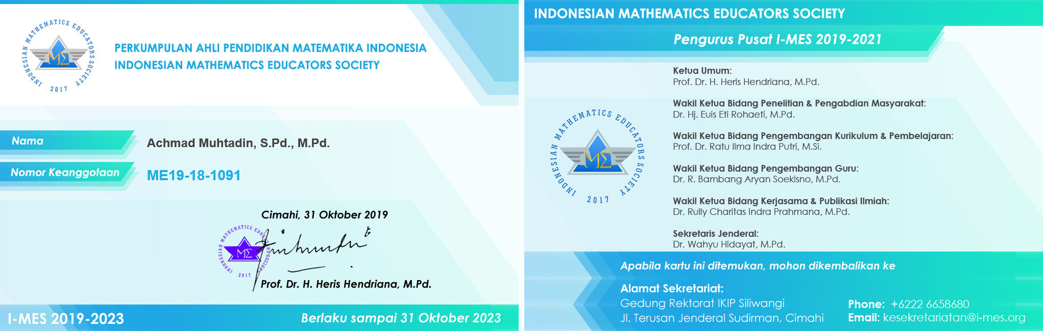 | Kartu Anggota I-Mesh.png | Anggota Perkumpulan Ahli Pendidikan matematika Indonesia (I-Mes: Indonesian Mathematics Educators Society) | 921.94 kB | image/png | View/Open |