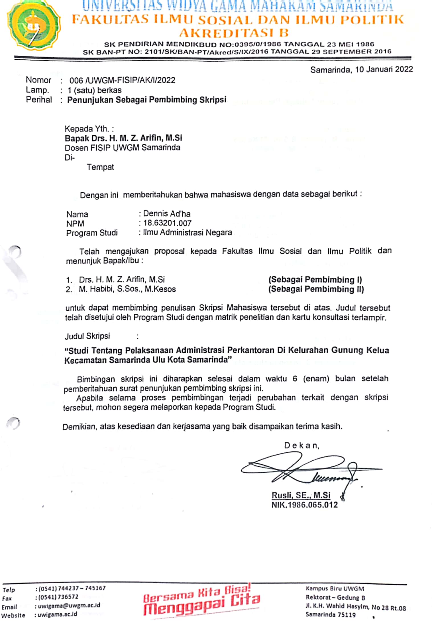 http://repository.unmul.ac.id/handle/123456789/41435| Title: | PENUNJUKAN PEMBIMBING I SKRIPSI MAHASISWA UNIVERSITAS WIDYAGAMA MAHAKAM SAMARINDA (AN. DENNIS ADHA) |