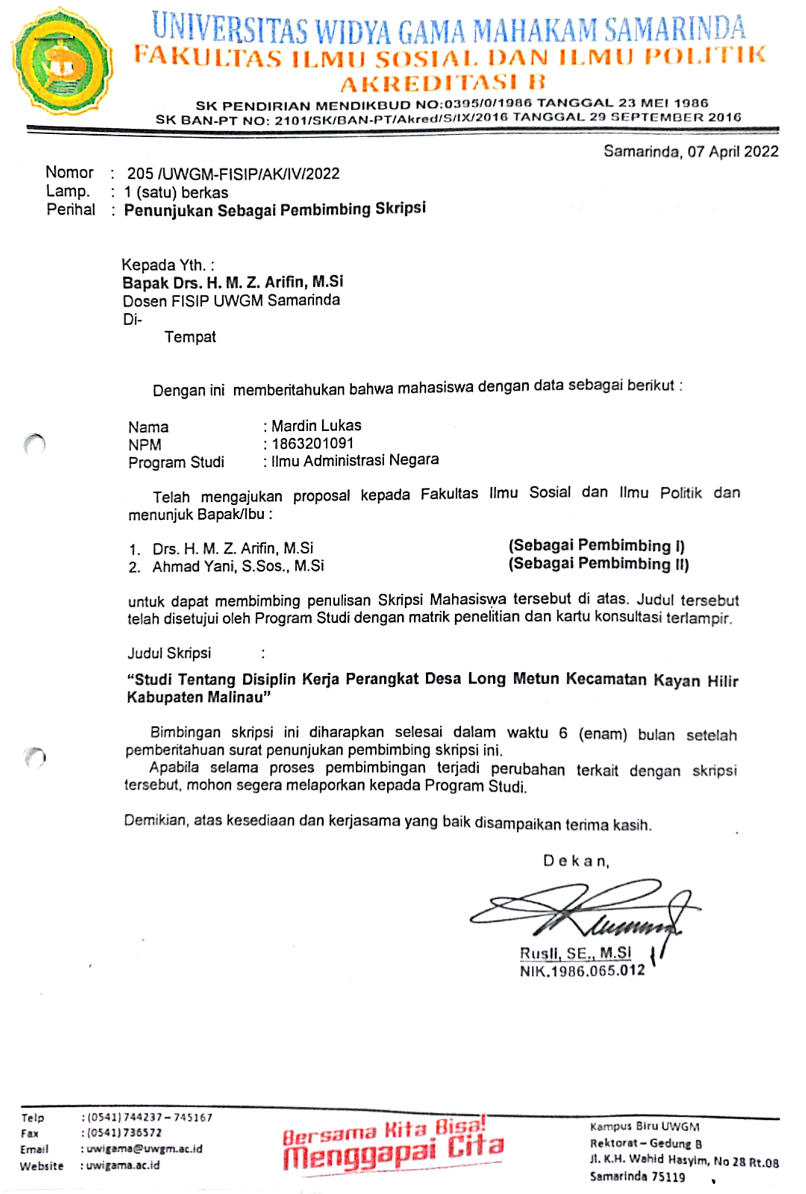 http://repository.unmul.ac.id/handle/123456789/41437| Title: | PENUNJUKAN PEMBIMBING I SKRIPSI MAHASISWA UNIVERSITAS WIDYAGAMA MAHAKAM SAMARINDA (AN. MARDIN LUKAS) |