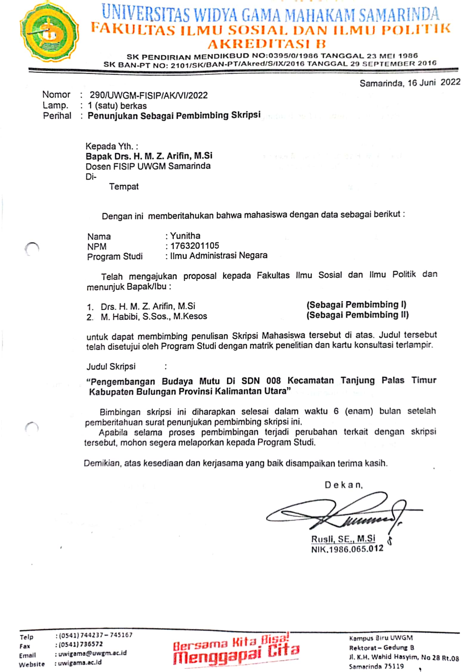 http://repository.unmul.ac.id/handle/123456789/41438| Title: | PENUNJUKAN PEMBIMBING I SKRIPSI MAHASISWA UNIVERSITAS WIDYAGAMA MAHAKAM SAMARINDA (AN. YUNITHA) |