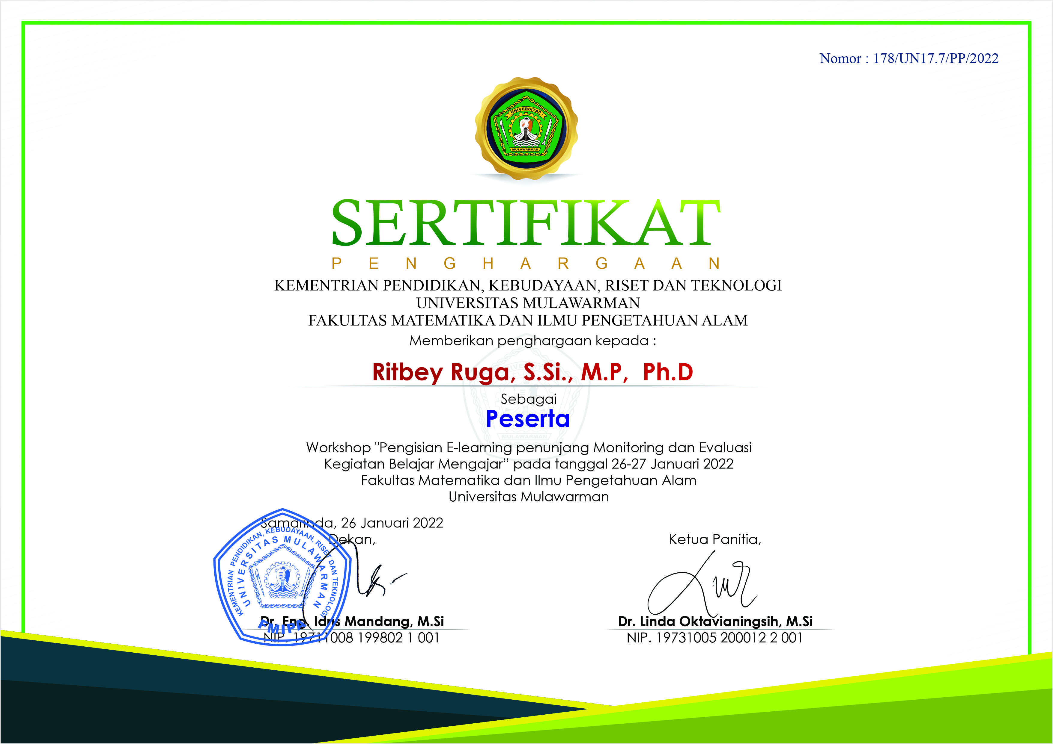 http://repository.unmul.ac.id/handle/123456789/45431| Title: | sertifikat pengisian e-learning penunjang monitoring dan evaluasi kegiatan belajar mengajar |