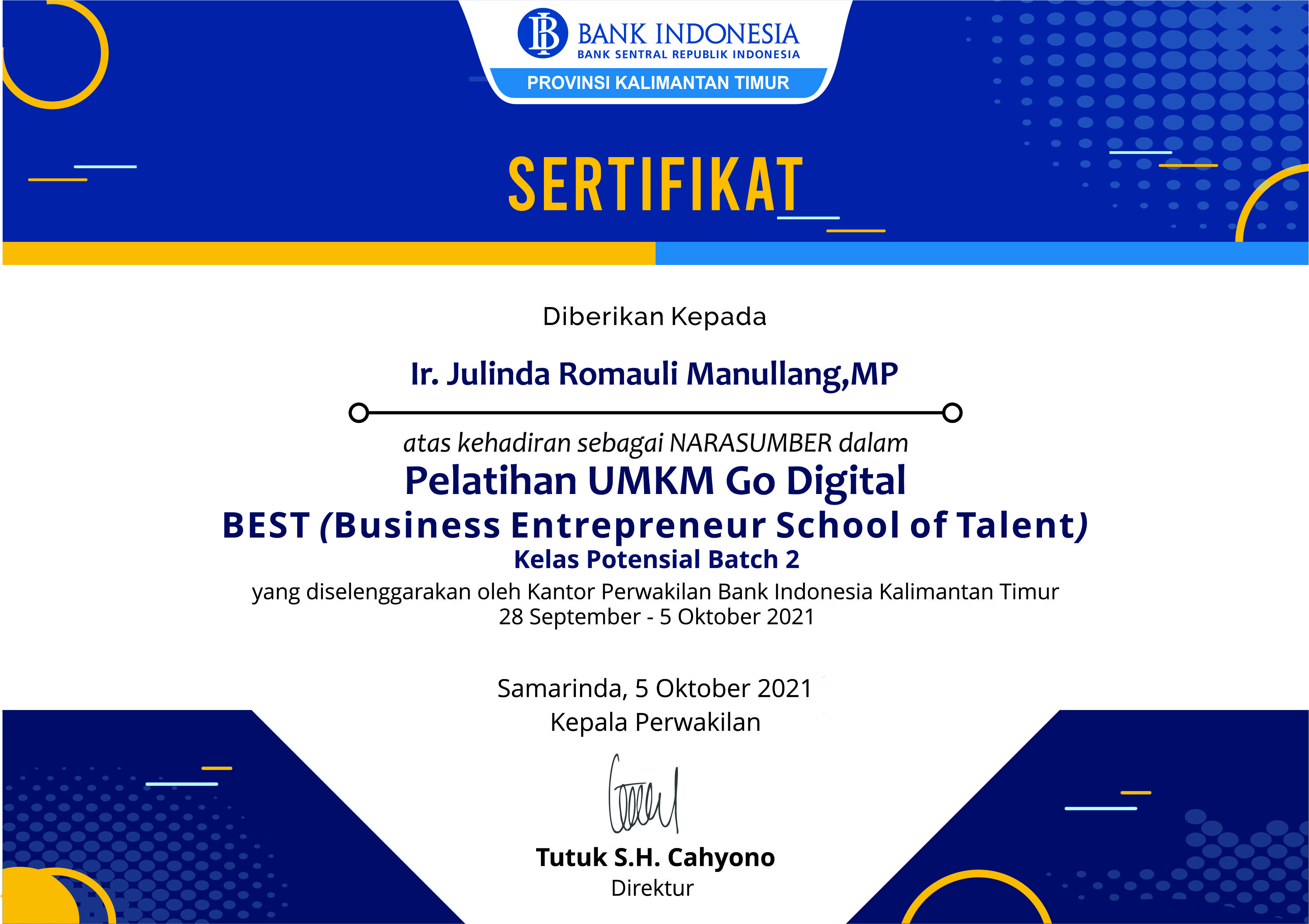 http://repository.unmul.ac.id/handle/123456789/8922| Title: | PELATIHAN UMKM GO DIGITAL BEST ( Business Entrepreneur School of Talent ) Kelas Potensial Batch 2 |