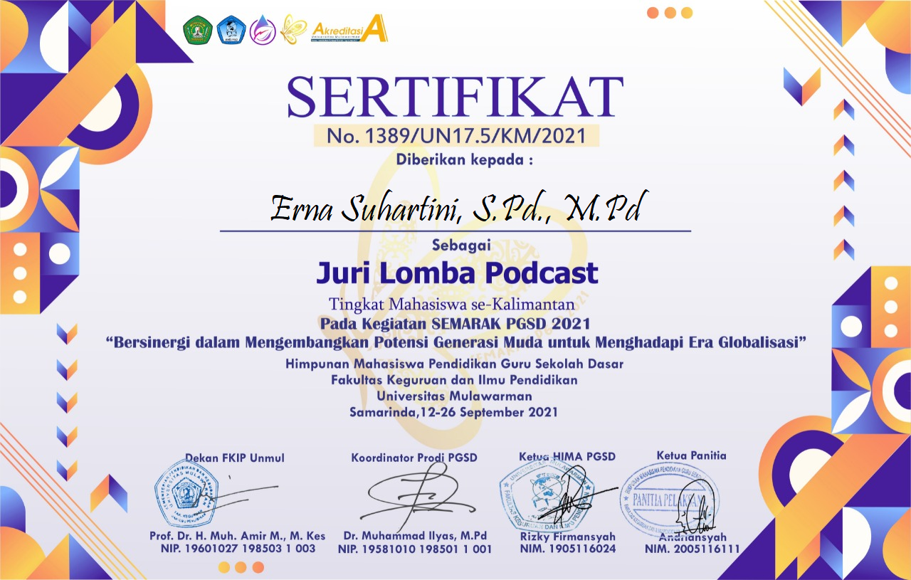 http://repository.unmul.ac.id/handle/123456789/9044| Title: | Juri Lomba Podcast Tingkat Mahasiswa Se-Kalimantan Timur pada Kegiatan SEMARAK PGSD 2021 |